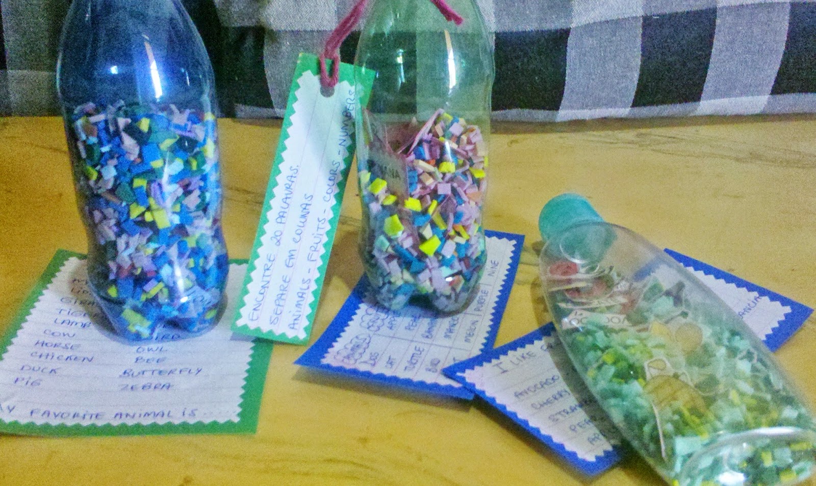 com essas garrafas, funciona super bem com as crianças pois é um caça palavras